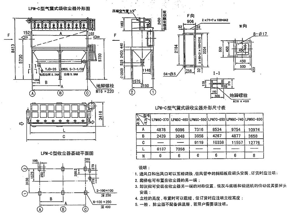 这是一种分室结构拼装式,由室顶脉冲阀对各室滤袋轮流进行分室停风气箱脉冲清灰(即所谓离线清灰)的袋式收尘器。它与一般喷吹式脉冲袋式收尘器的清灰不同,喷吹脉冲清灰是在同一个过滤室内只对其中各排滤袋逐排进行喷吹清灰(即所谓在线清灰),而其它排滤袋仍进行过滤,即清灰与过滤同时在一室中混合进行,清下的粉尘二次飞扬,有部分会被相邻滤袋收去,不利于含尘深度较大的气体过滤。LPM型分室气箱脉冲是在一个室内关阀停止过滤情况下进行的,清下的粉尘即向下沉降于灰斗内,不产生二次飞扬,极利于过滤粉尘浓度大的气体,而且可不停机更换一个室的滤袋。